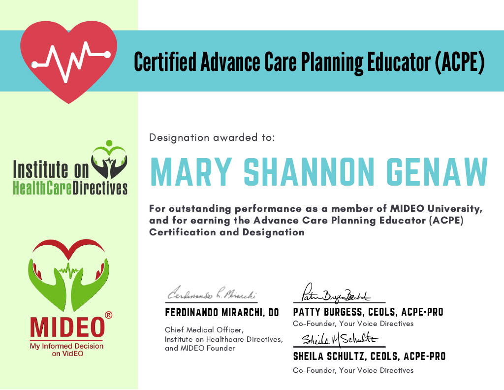 An Advanced Care Planning Educator is a member of a the MIDEO™ team. They help guide people through the process of completing necessary health forms and making their MIDEO™ physician appointment. They are a professional voice in organizations and communities.